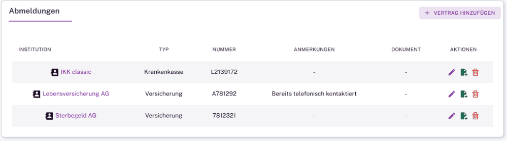 Verwalten Sie alle Abmeldungen bei Behörden, Krankenkassen und Institutionen zentral. Mit Filterung nach Typ und Institution behalten Sie stets den Überblick.